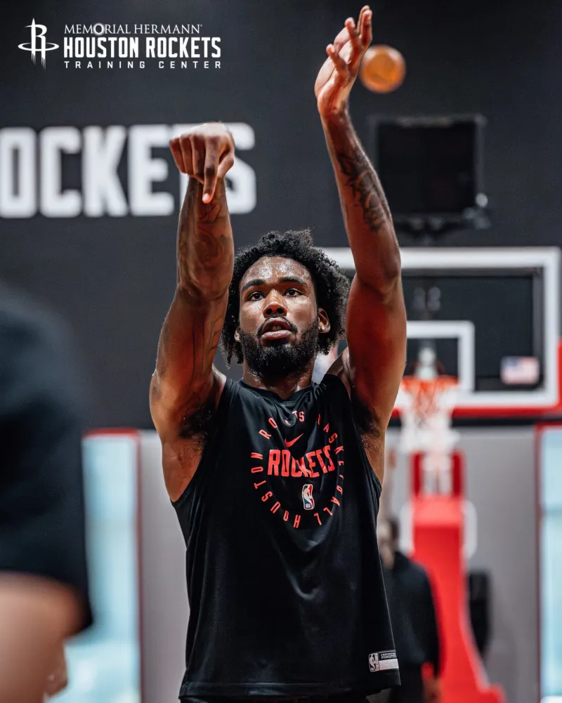 防守大闸!火箭社媒晒伊森现身火箭训练馆的训练组图