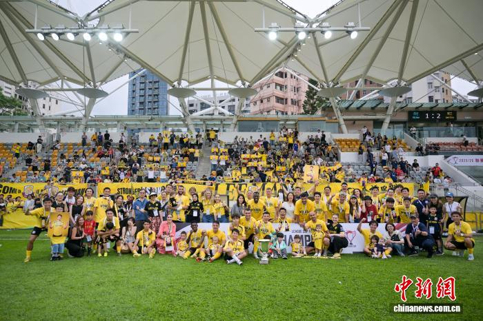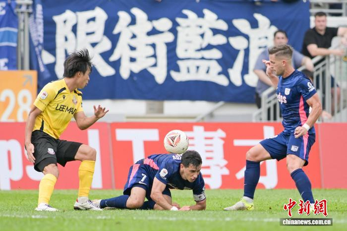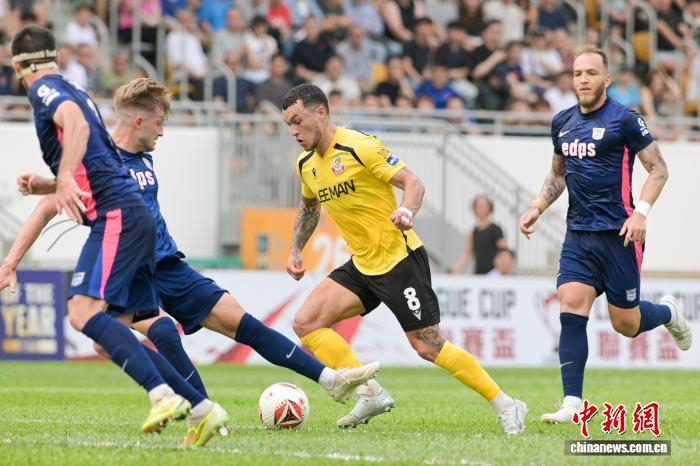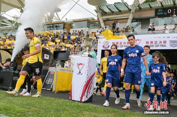 4月7日,2025-26年度中国香港足球总会联赛杯决赛在香港旺角大球场上演,理文队以2:1击败杰志队,夺得冠军。理文队成立于2017年,是香港足坛劲旅。图为理文队球员胡晋铭(黄衣)与杰志队球员利安度拼抢。中新网记者 陈永诺 摄